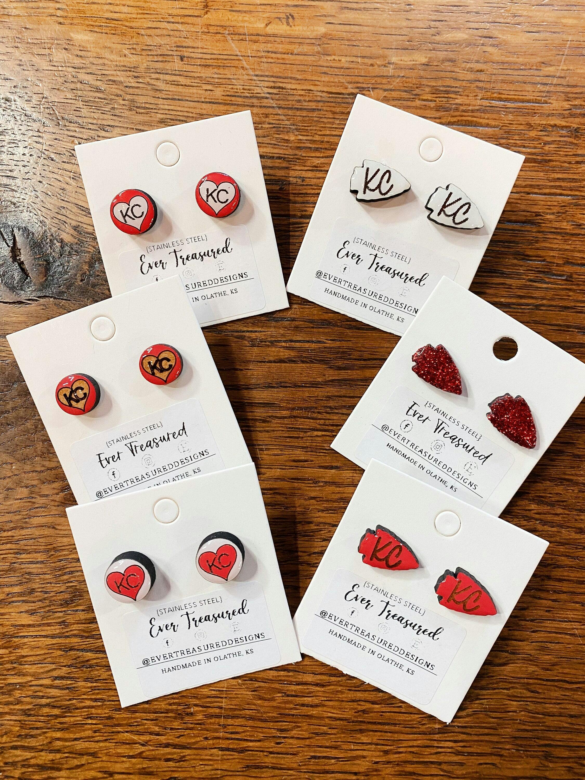 Show your Kansas City Chiefs pride in a more subtle way with our handmade sterling silver stud earrings. Arrowhead and ❤️ KC styles are perfect for daily and Gameday wear.