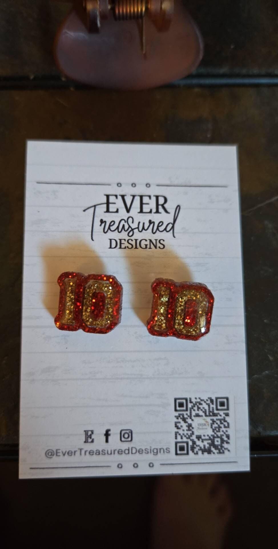 Show your Kansas City Chiefs for your favorite player with these high shine glitter bling acrylic stud earrings!