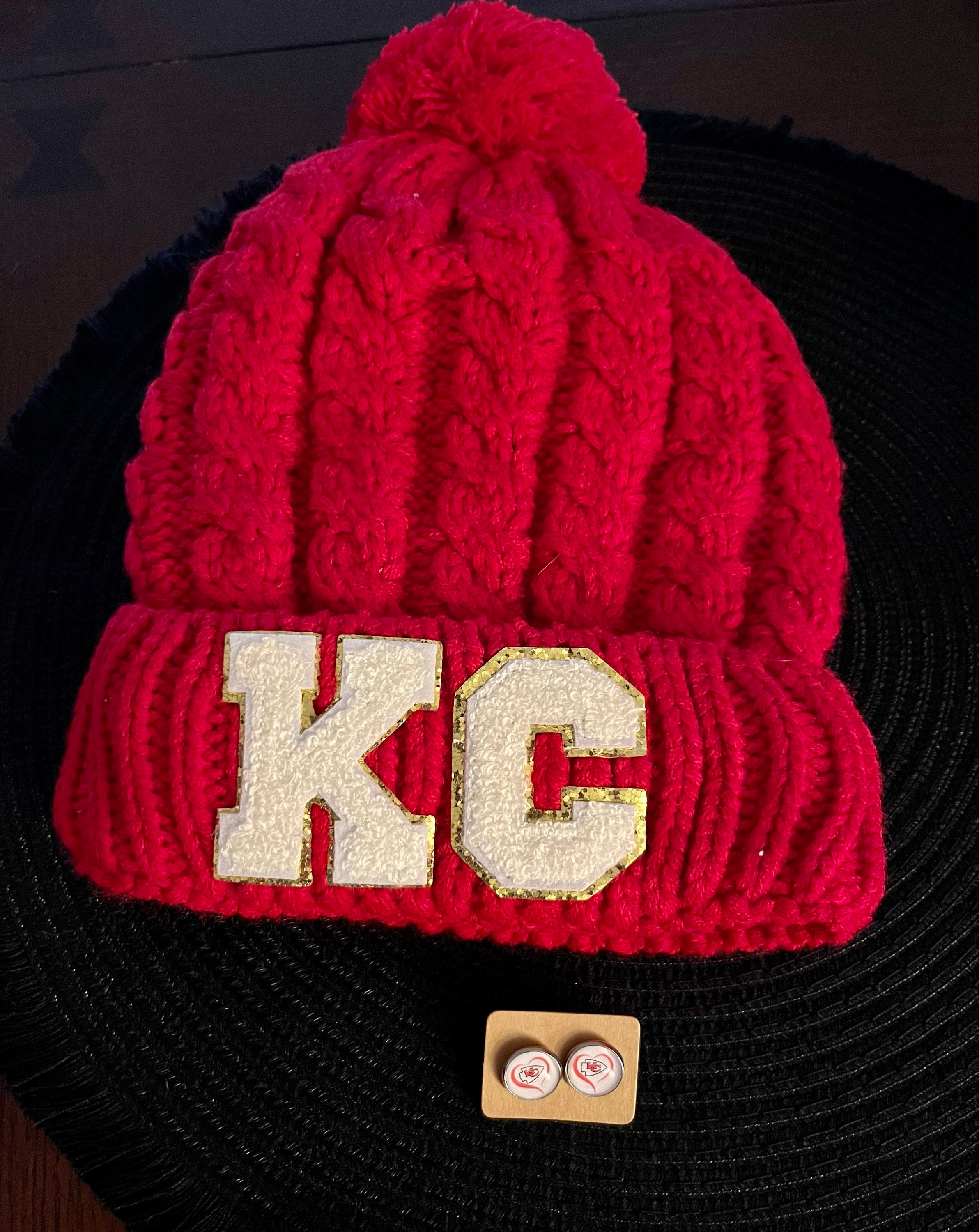 Our KC Beanie is perfect to pair with your favorite Chiefs Gameday gear! Available in Red & Gold & White these chunky cable knit beanies are oh so warm and super cute with the faux fur Pom and KC in chenille letters with gold glitter outline.